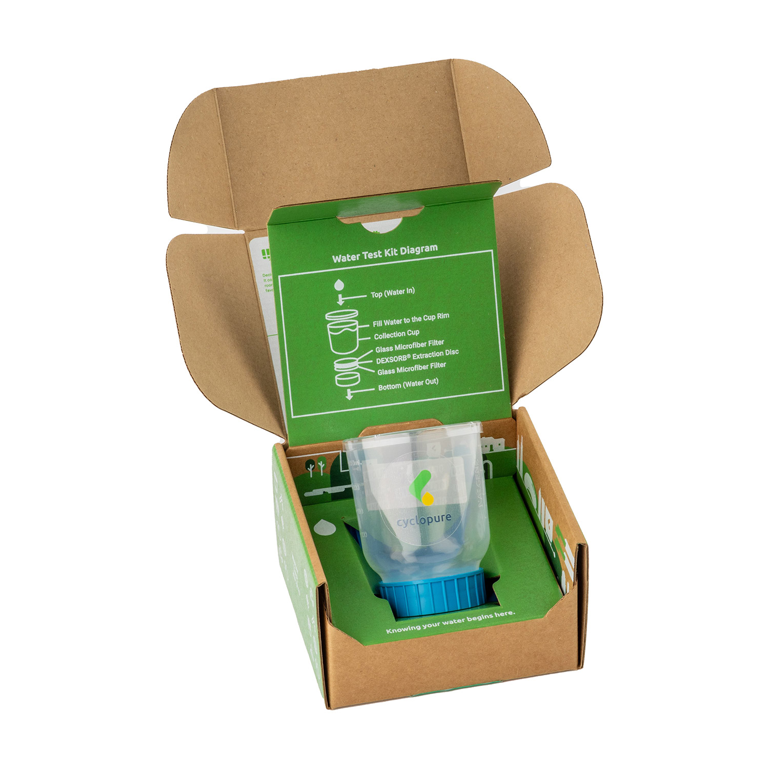 Cyclopure’s kit uses a DEXSORB extraction disc; you pour water through a special cup, trapping PFAS on a disk you send to the lab. It screens for 55 PFAS, including GenX, down to 1 ppt